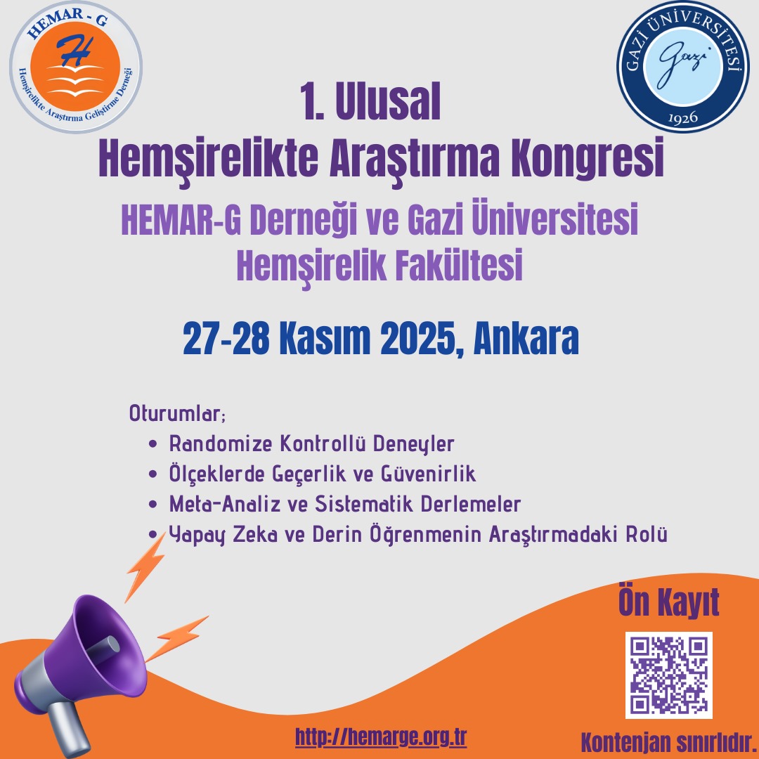 Hemşirelikte Araştırma Geliştirme Derneği tarafından Gazi Üniversitesi Hemşirelik Fakültesi iş birliğinde düzenlenecek olan 1.Ulusal Hemşirelikte Araştırma Kongresi 27-28 Kasım 2025 tarihlerinde Ankara'da gerçekleştirilecektir. Kontenjanı sınırlı olan bu etkinliğe afişteki QR kodu okutarak ön kayıt yaptırabilirsiniz. Ön kayıt için son tarih 30 Eylül 2025.